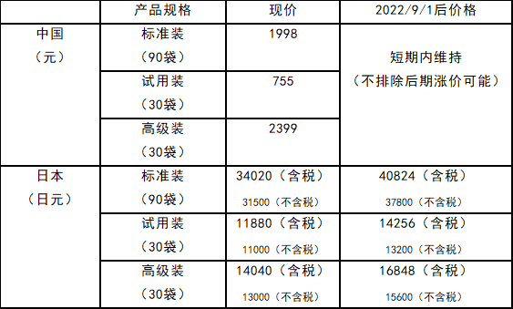 今接日本百傲鲨总公司通知,近年来,百傲鲨软骨粉的产品原材料价格及生产物流等各项费用不断攀升。为消化成本,抑制售价,长期以来,公司内部一直致力于提高生产效率、节约各项经费,但因上述因素均为中长期持续,仅靠一家公司的努力已无法独立解决,为此,不得不拟定于202291日开始,提高产品售价,具体如下表。